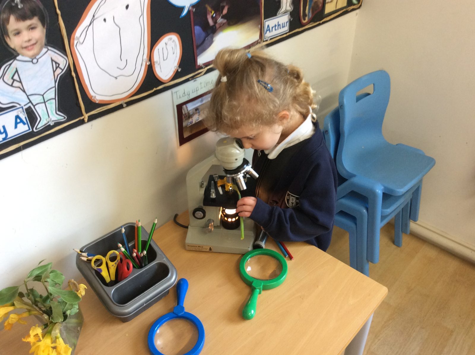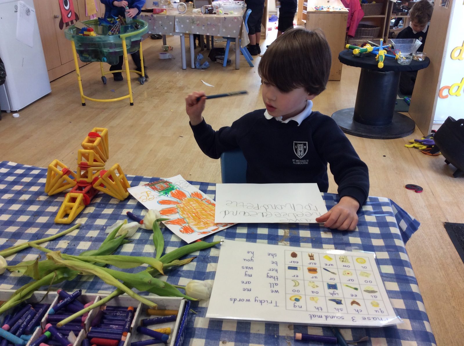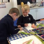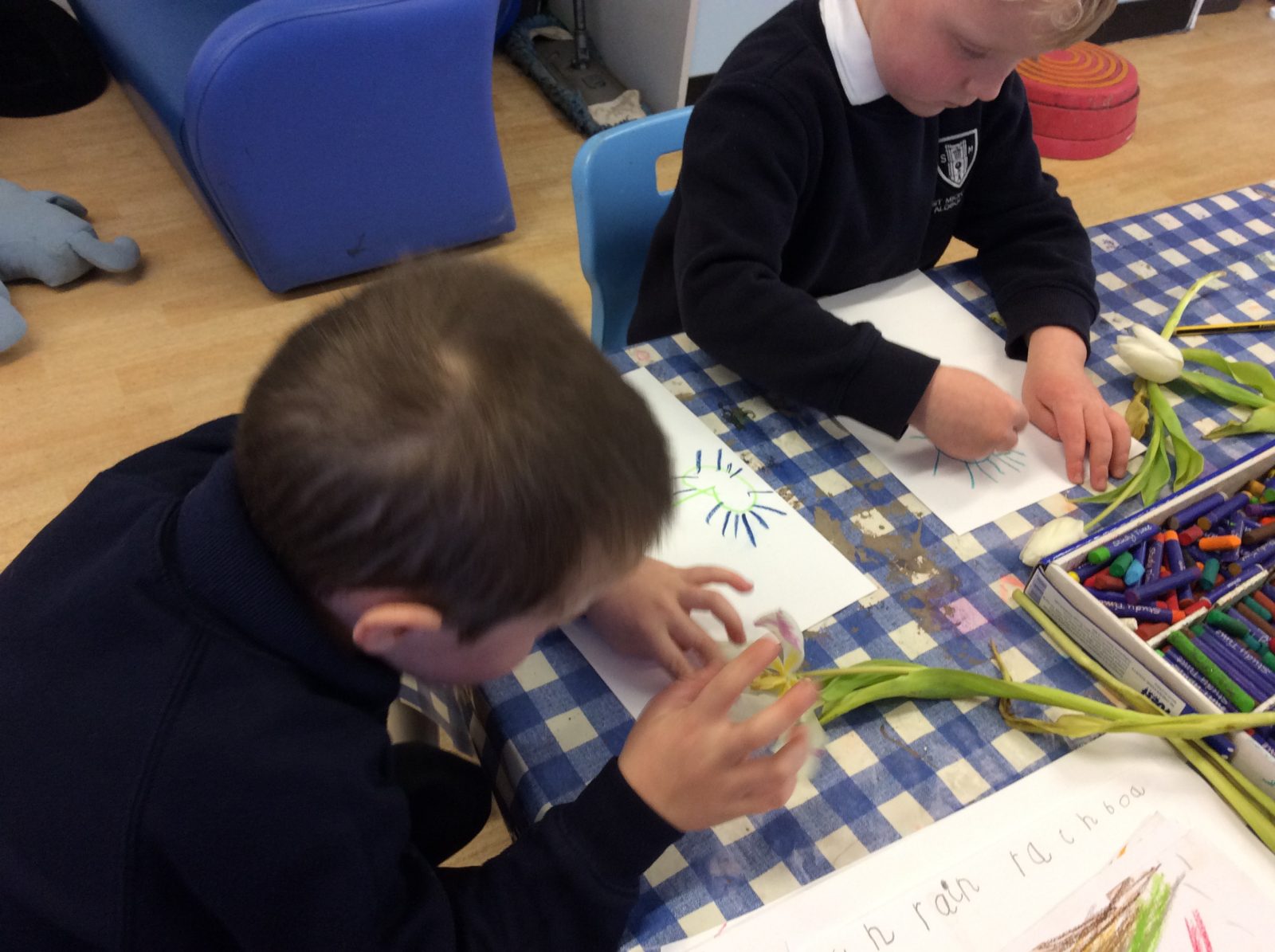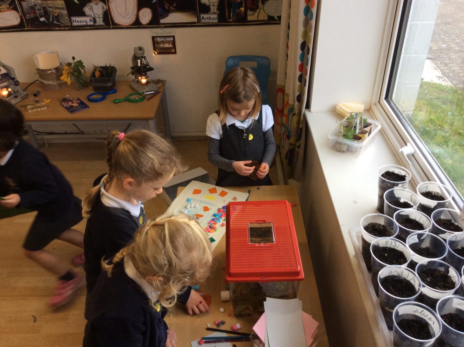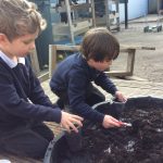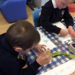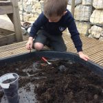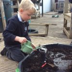 We have continued our work exploring Growing! We learned about plants this week and what they need to grow. We found out that leaves can turn sunlight into food and that bees are an important part of the life cyce of a plant, spreading pollen so that a new seed can be formed. The children have enjoyed planting beans (we found some worms when we were planting!), looking closely at plants, drawing and writing about what they found. Our tadpoles arrived this week and this has inspired more art work, writing and lots of observation and talking!