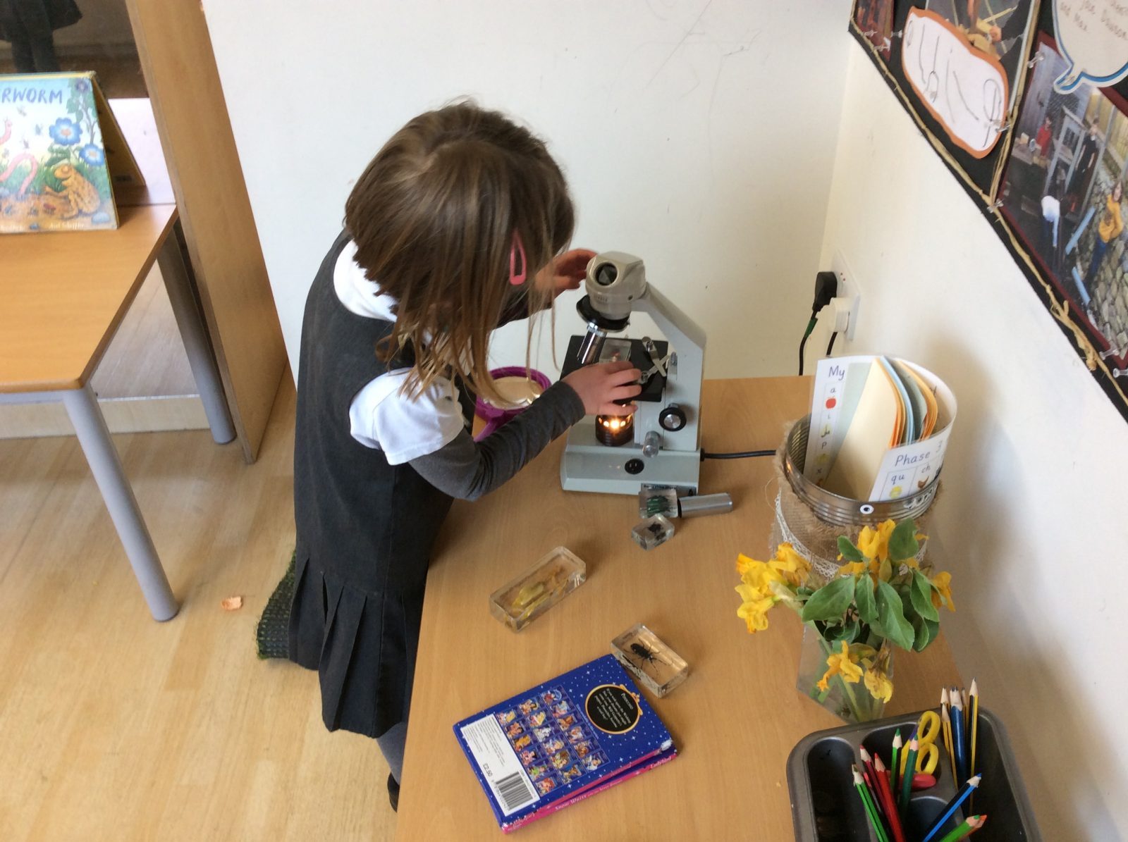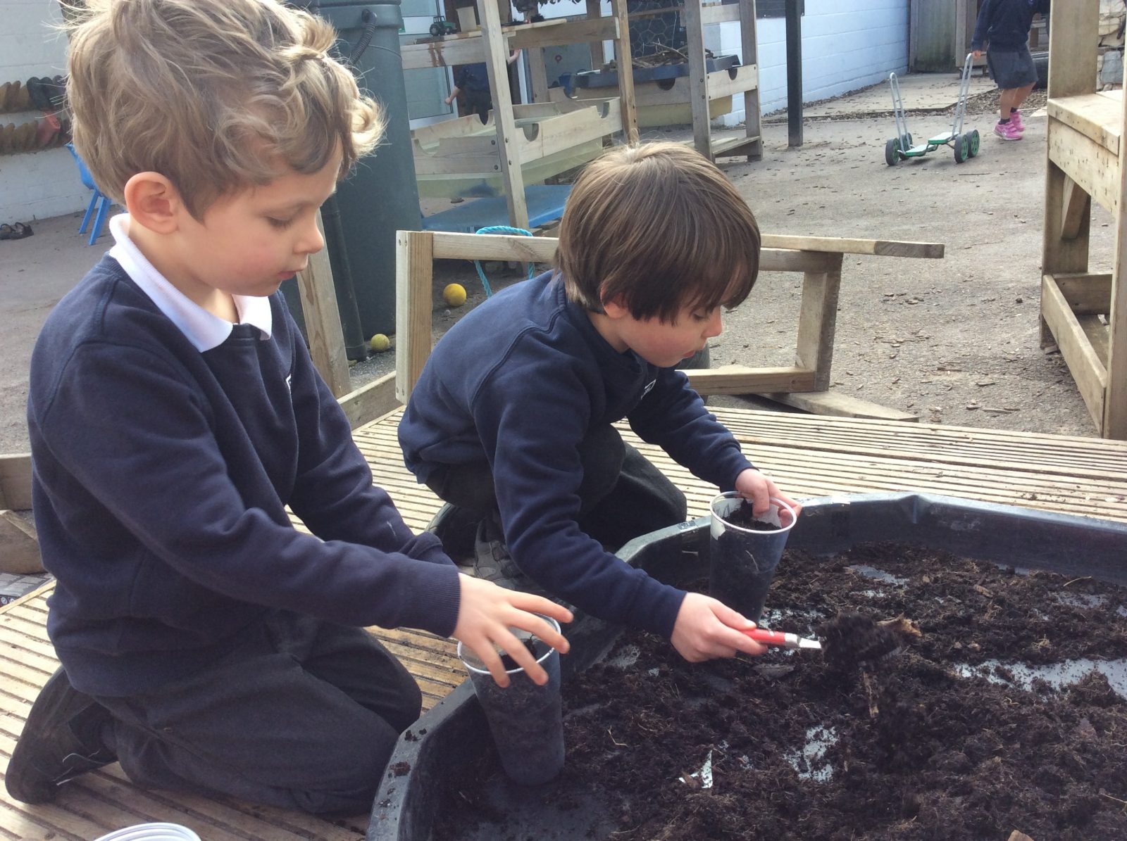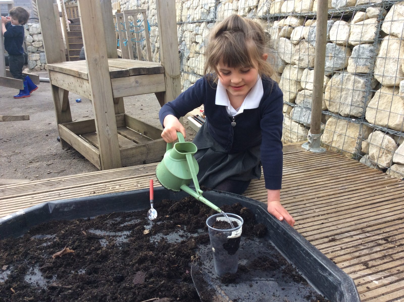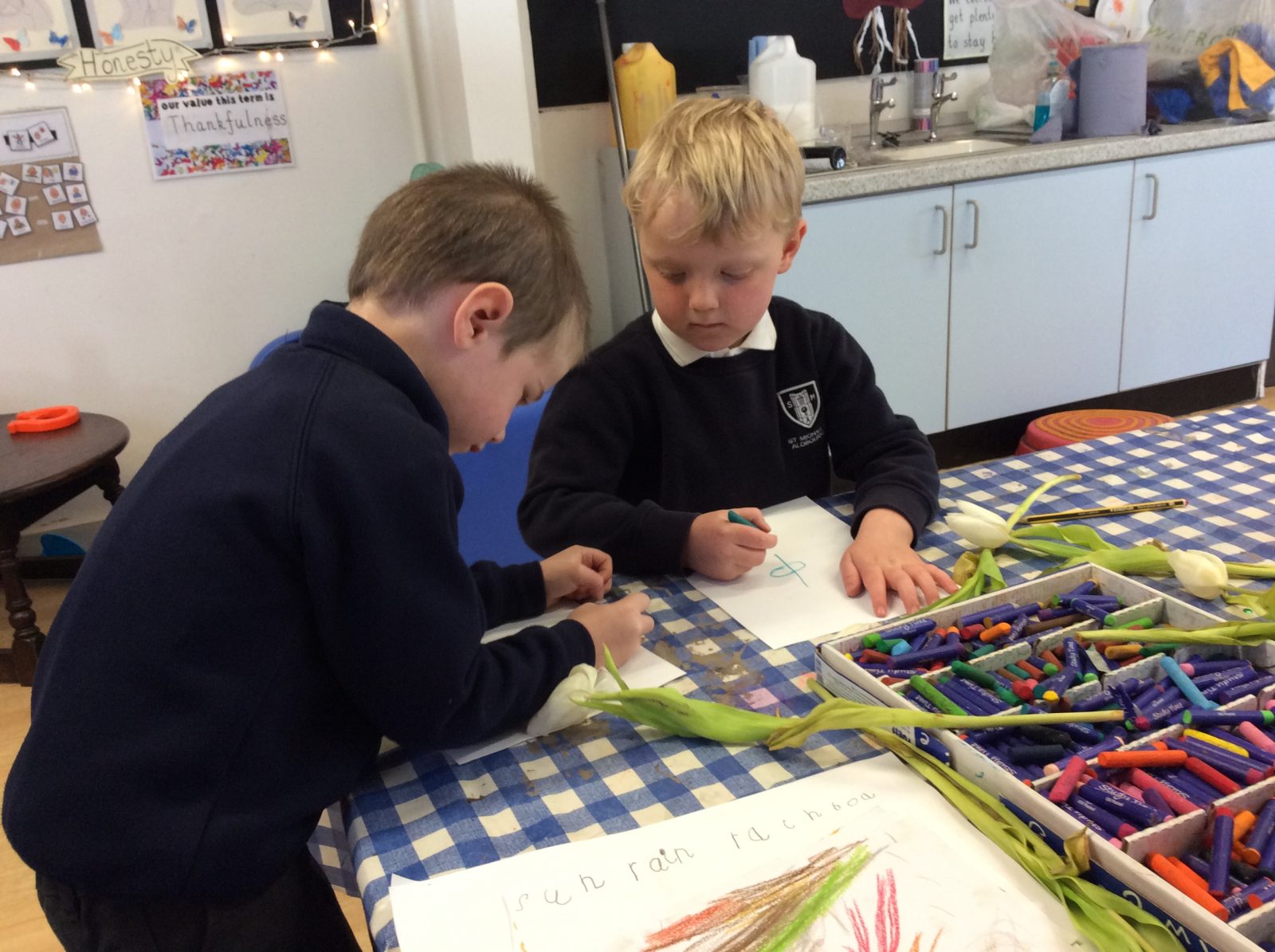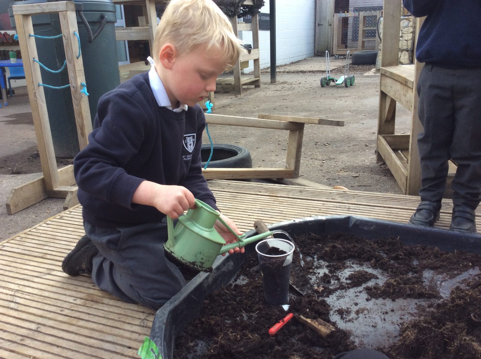 We have continued our work exploring Growing! We learned about plants this week and what they need to grow. We found out that leaves can turn sunlight into food and that bees are an important part of the life cyce of a plant, spreading pollen so that a new seed can be formed. The children have enjoyed planting beans (we found some worms when we were planting!), looking closely at plants, drawing and writing about what they found. Our tadpoles arrived this week and this has inspired more art work, writing and lots of observation and talking!