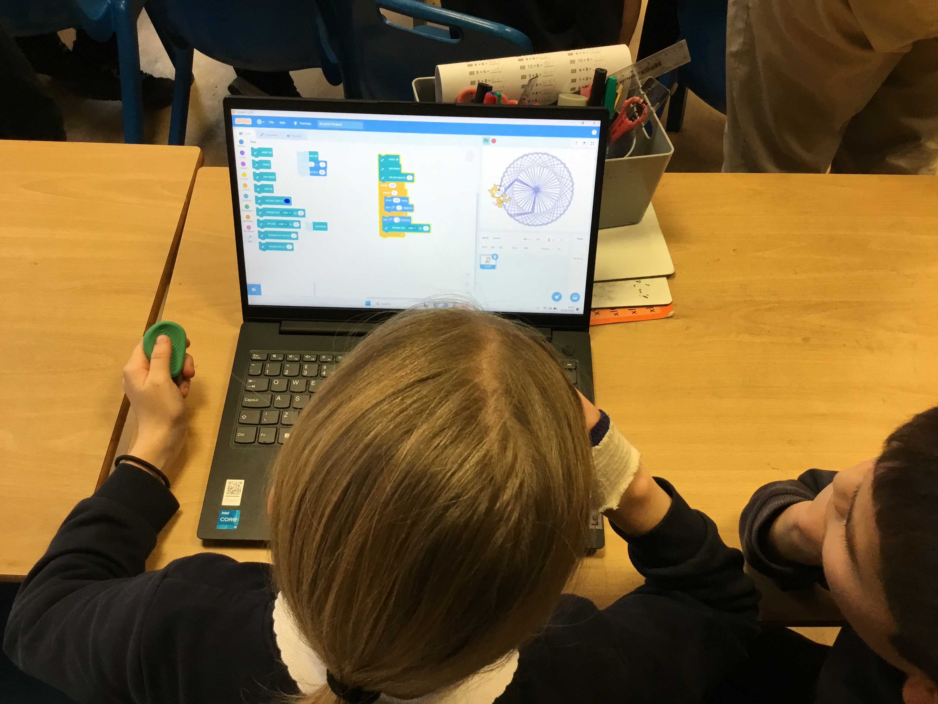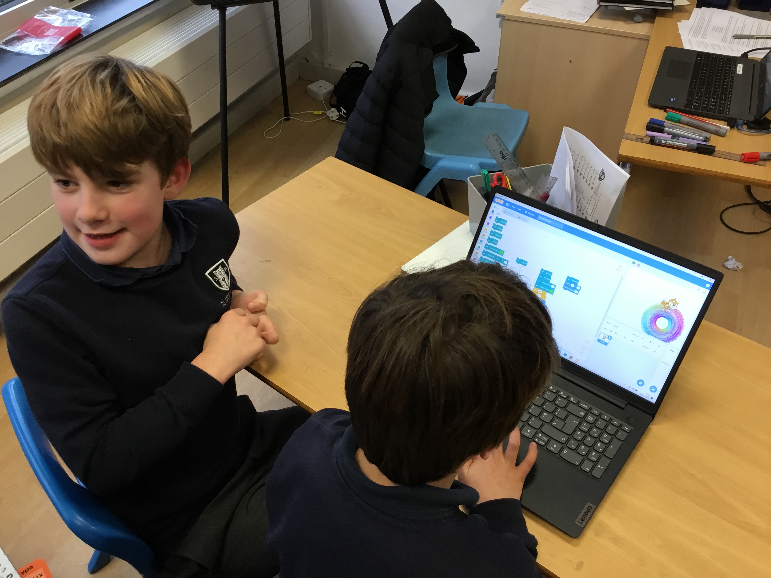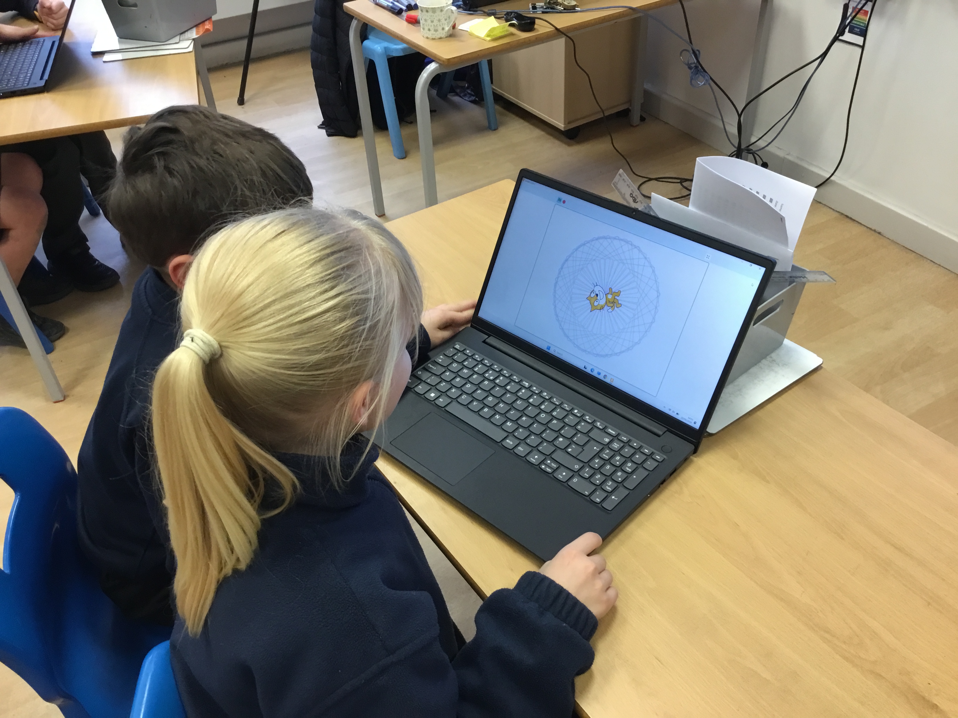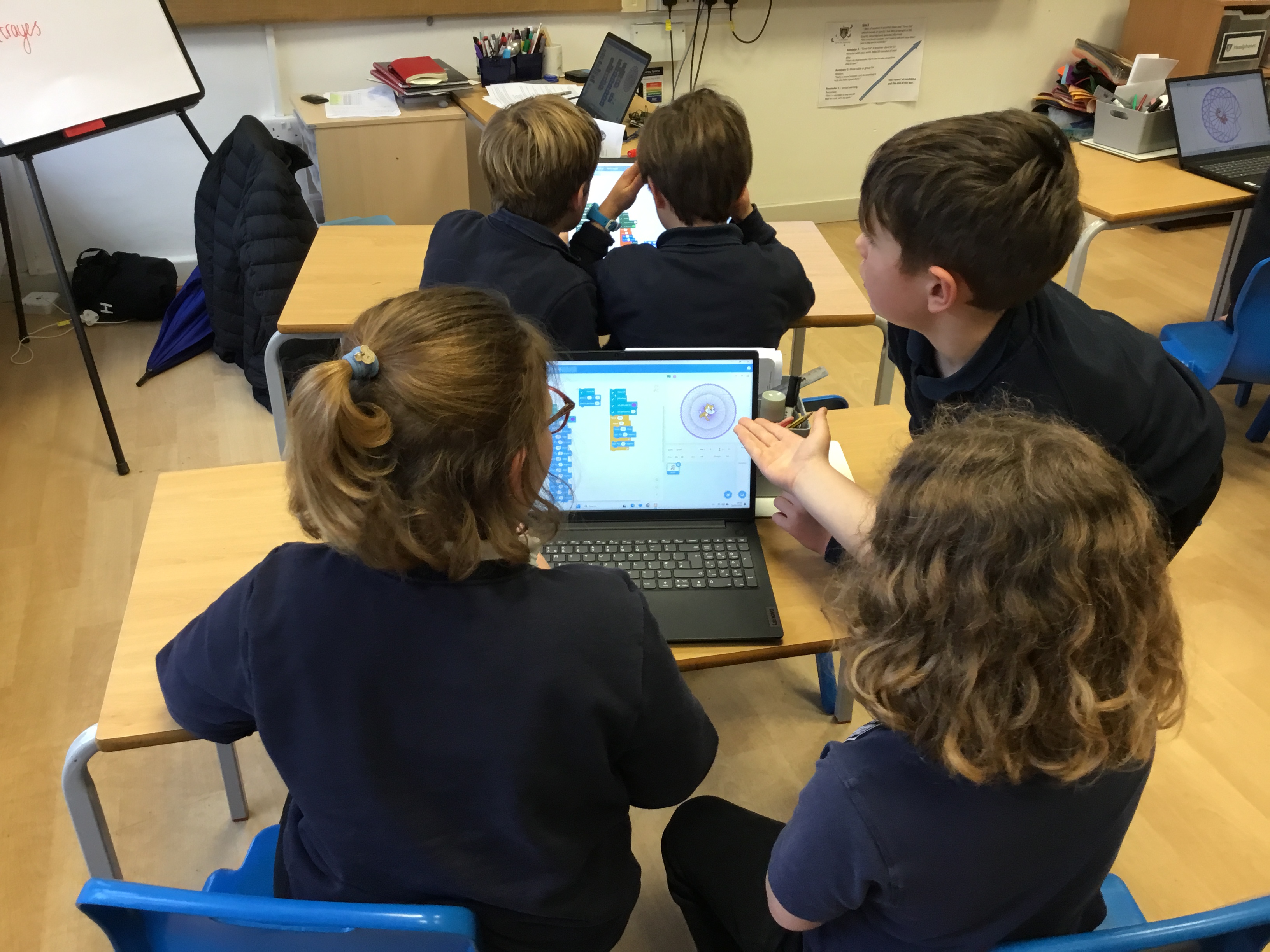 Later this week in computing, we had a go at making patterns using code in the computer programme Scratch. It reminded us of ‘Spirograph’ and we had great fun creating different shapes and patterns using a variety of colours. We experimented with changing the code to see how it affected our designs and were really proud of the creative results we produced. It was exciting to see how coding can be used to make art as well as help us develop our computing skills!