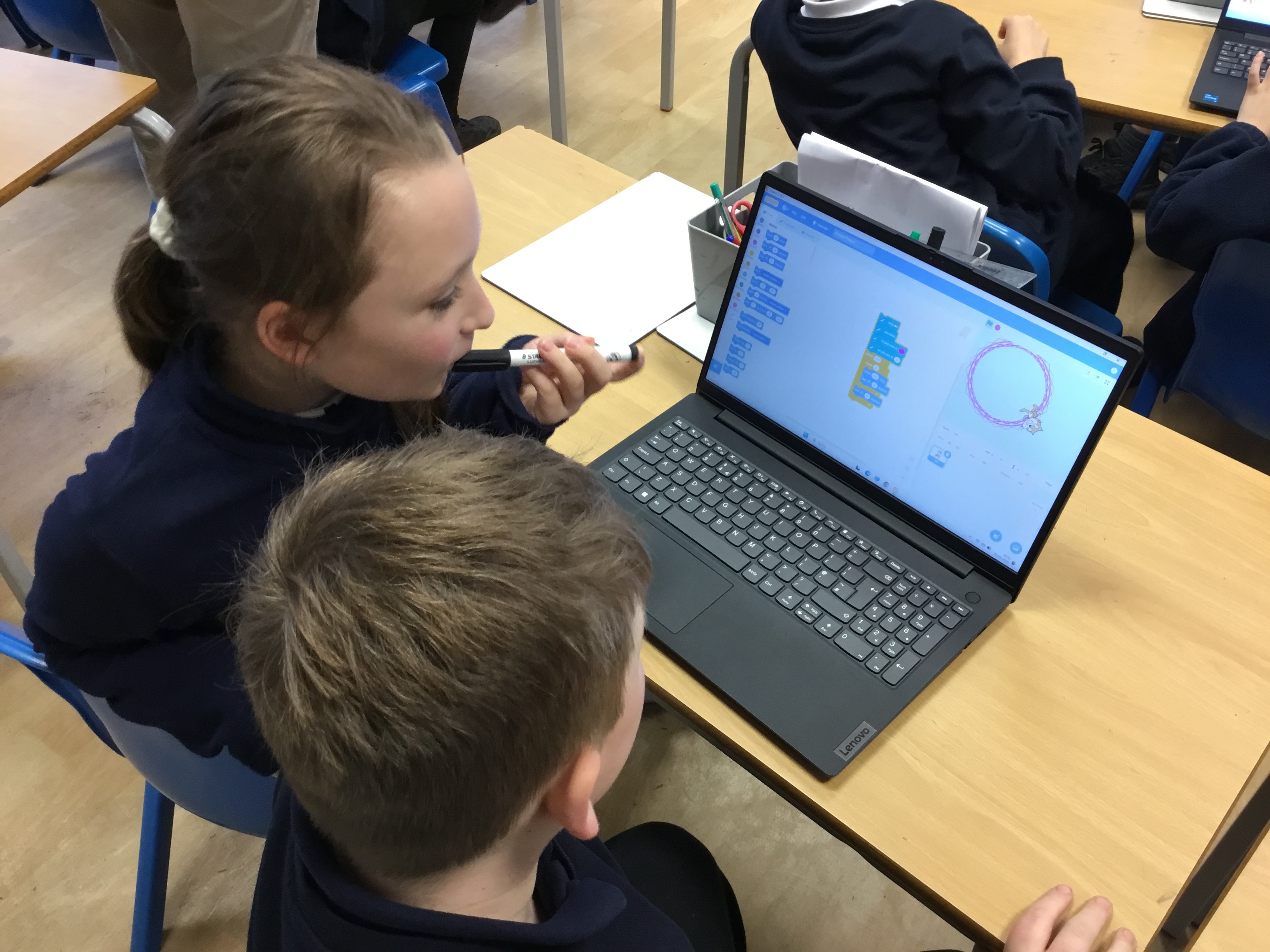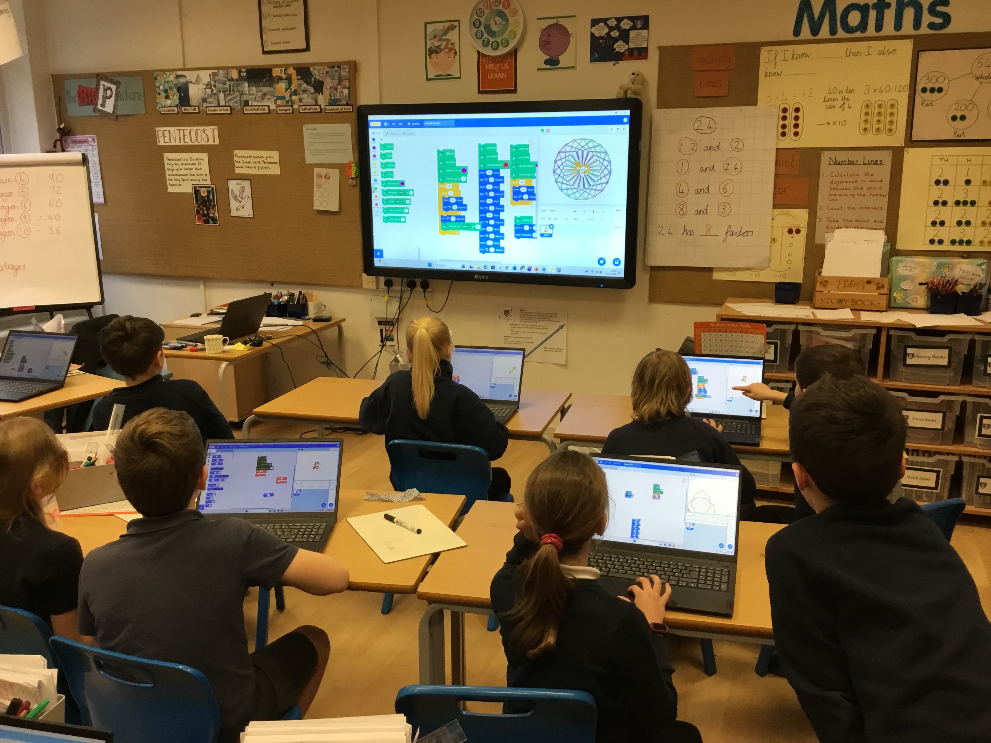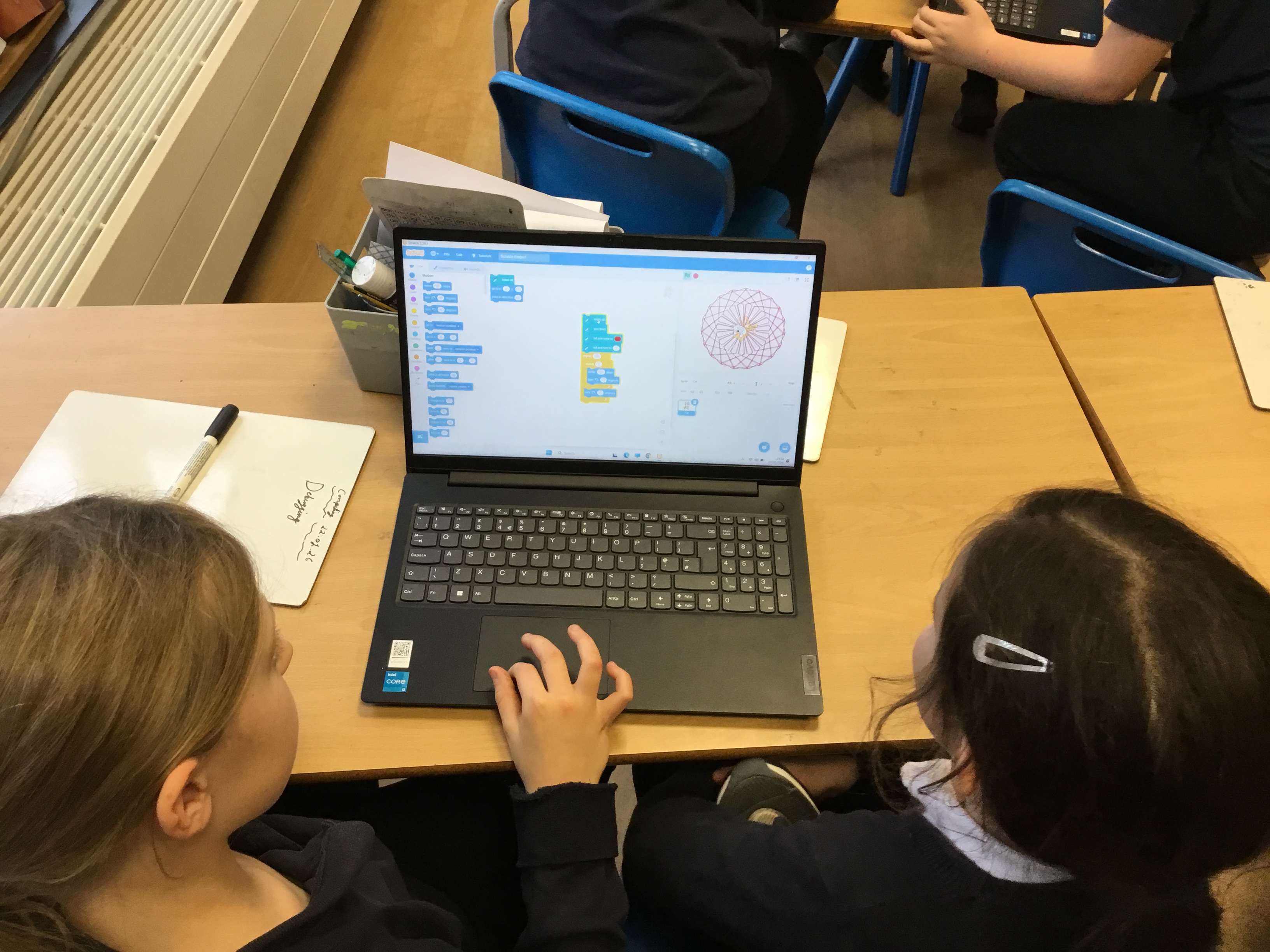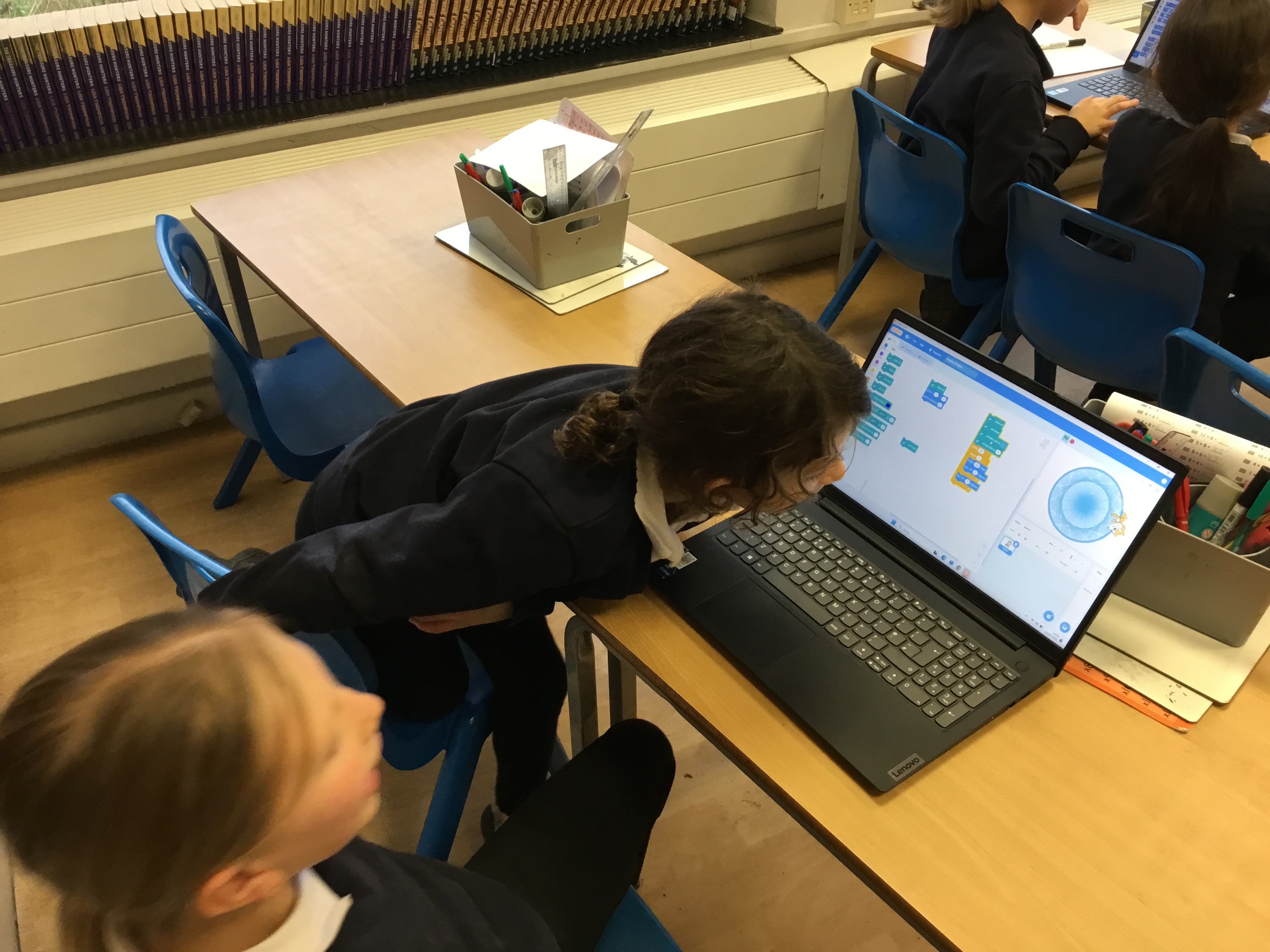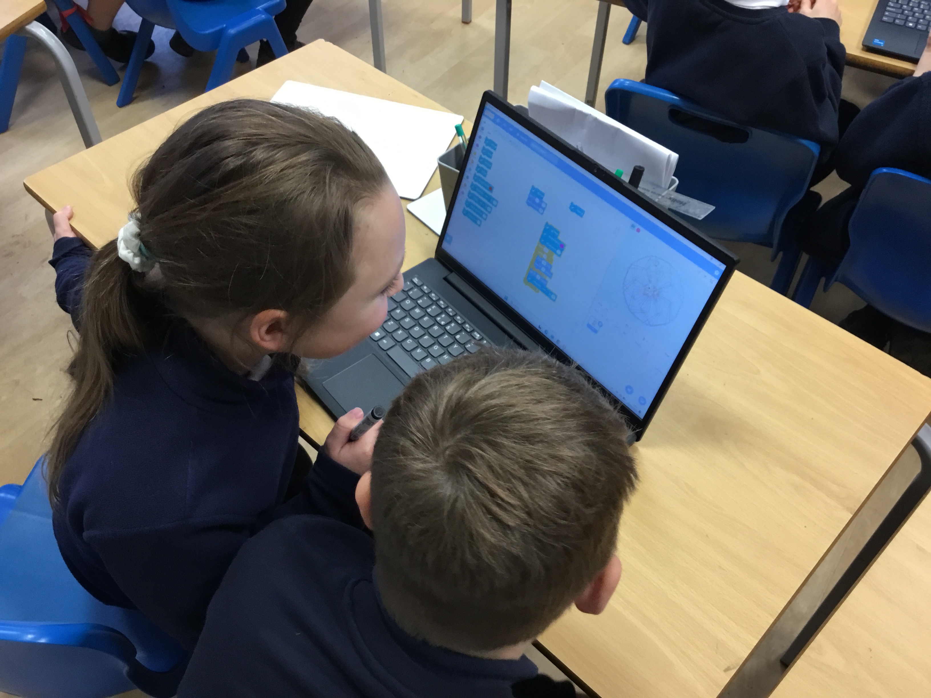 Later this week in computing, we had a go at making patterns using code in the computer programme Scratch. It reminded us of ‘Spirograph’ and we had great fun creating different shapes and patterns using a variety of colours. We experimented with changing the code to see how it affected our designs and were really proud of the creative results we produced. It was exciting to see how coding can be used to make art as well as help us develop our computing skills!