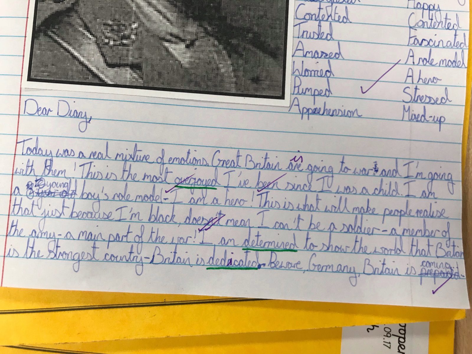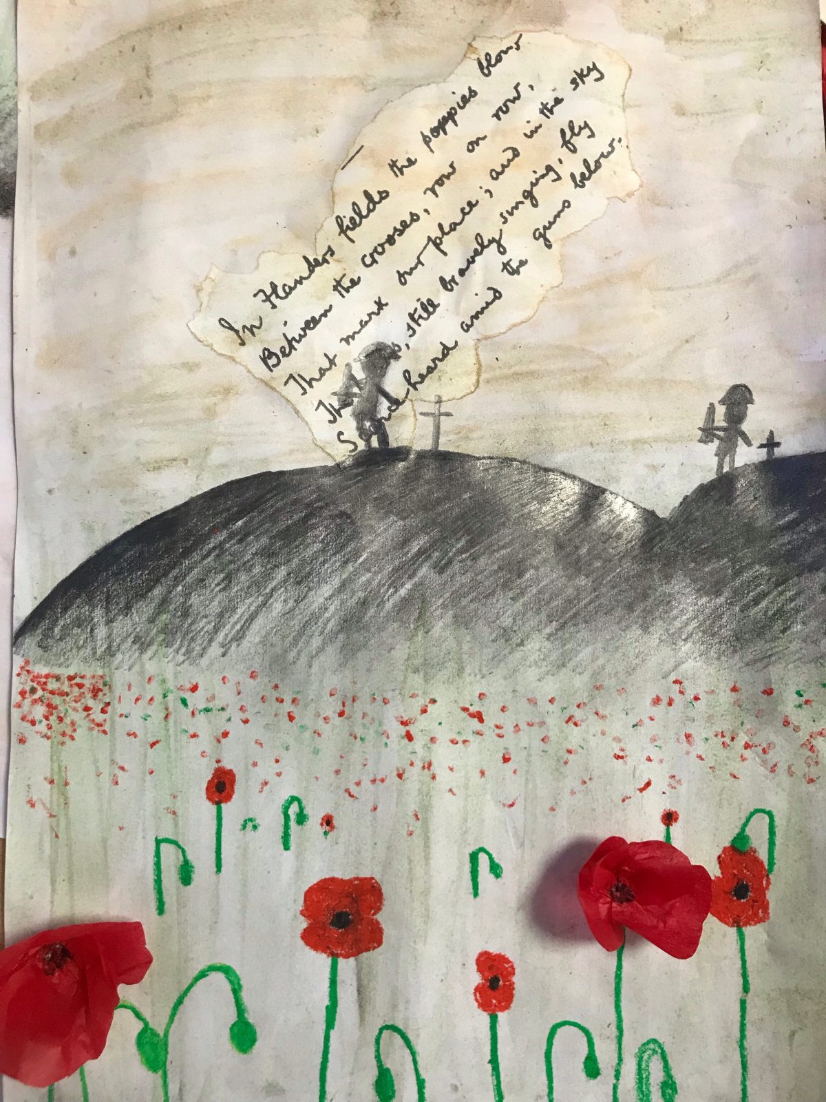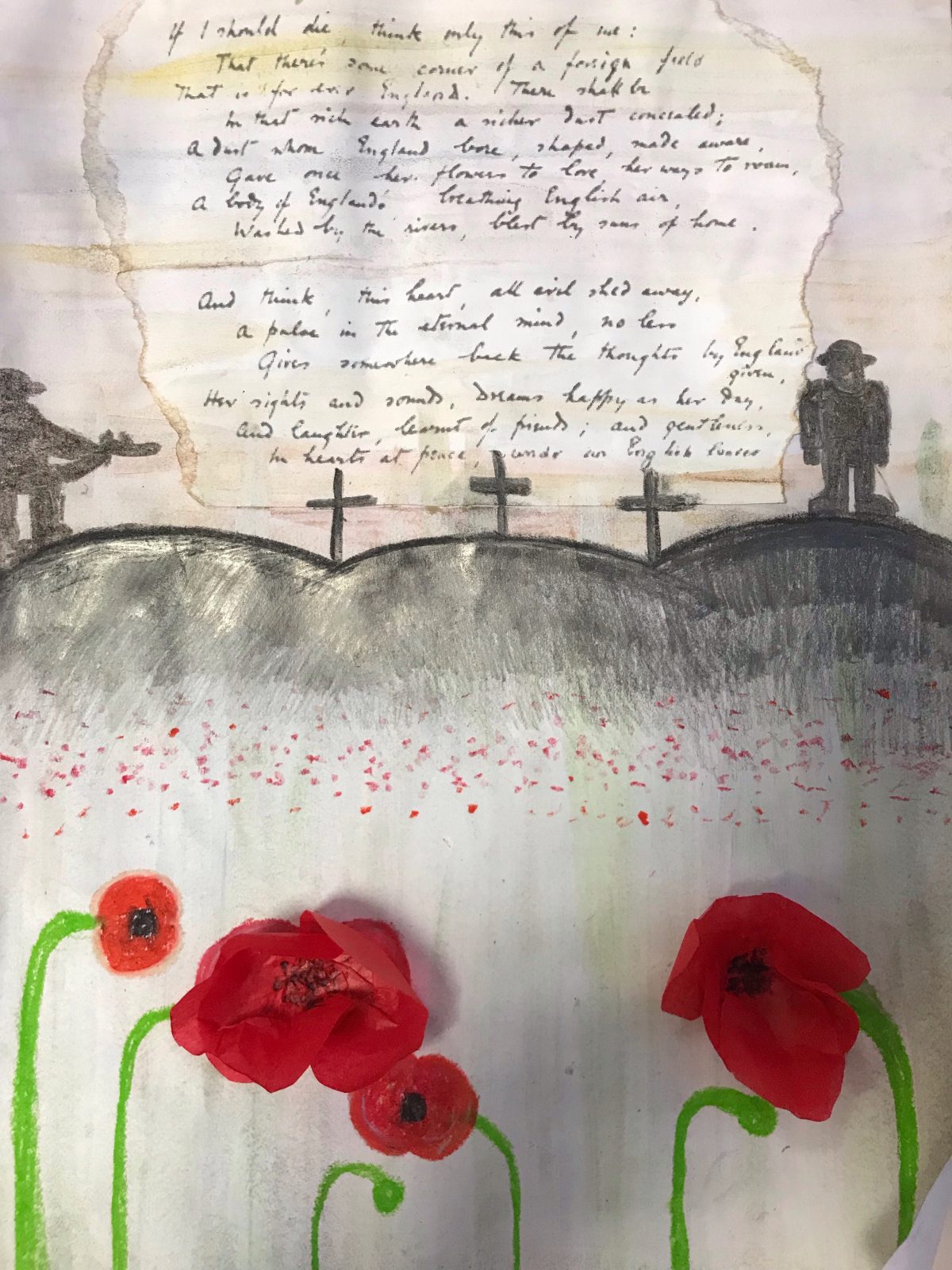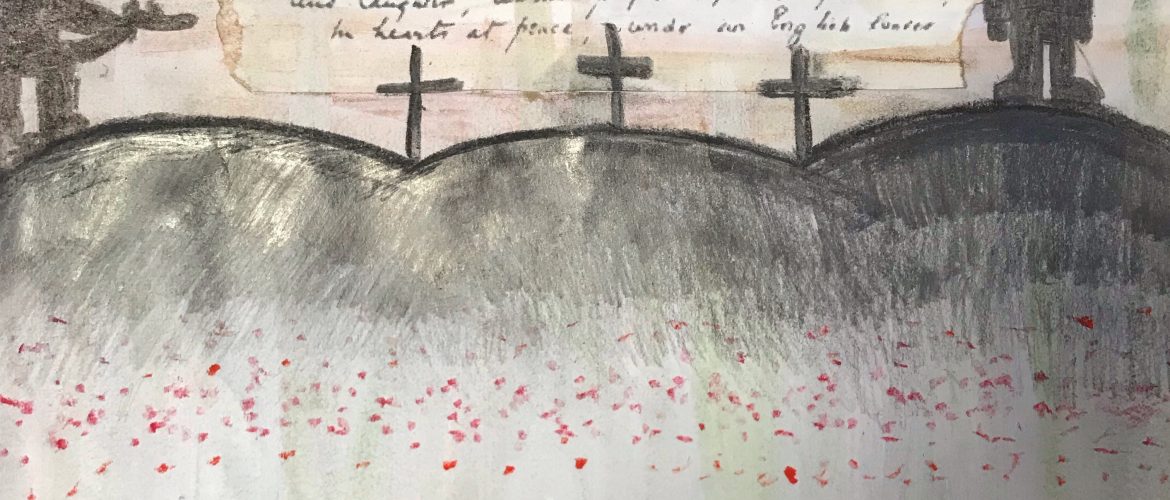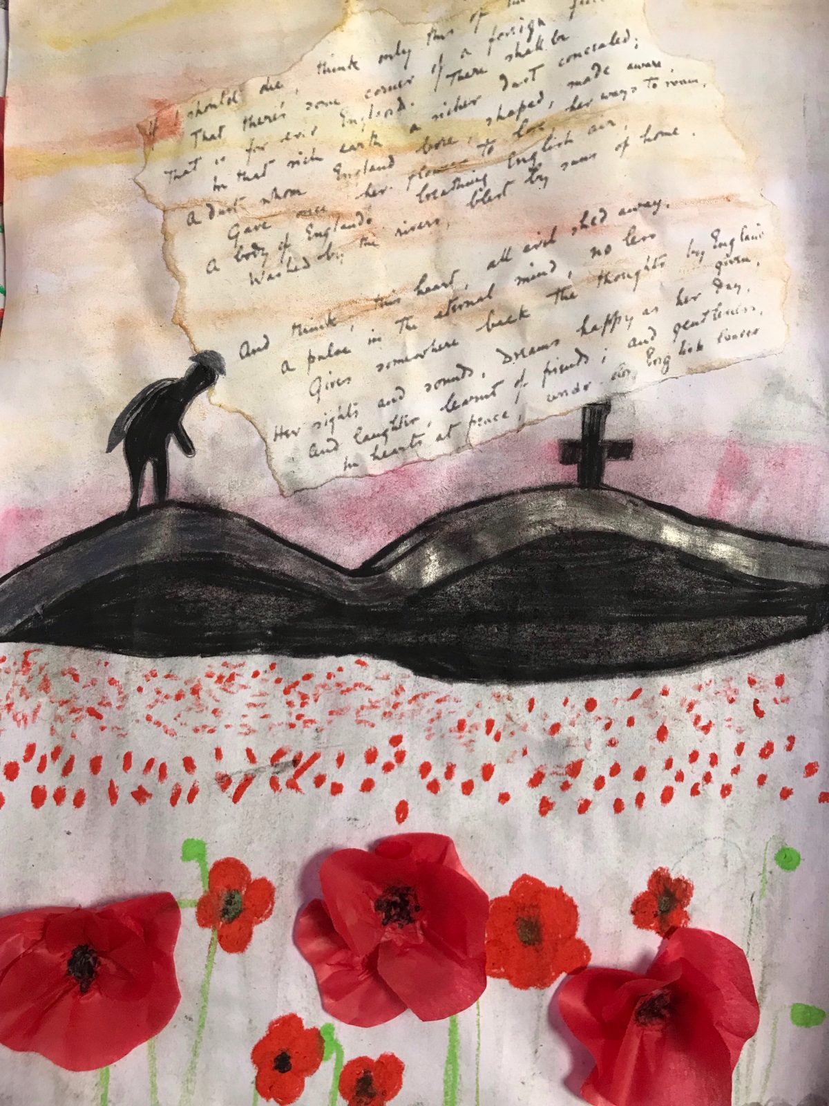 Back in class we took inspiration from Danny Boyle’s Pages of the Sea. We spent time researching some of the heroes from World War One, producing diary entries based on the emotions people felt at the start of the war before creating art work reflecting on the realities of being a soldier during wartime.