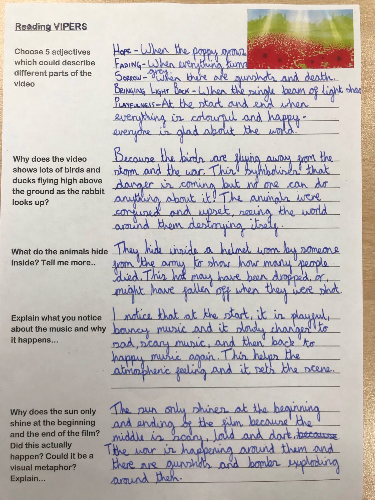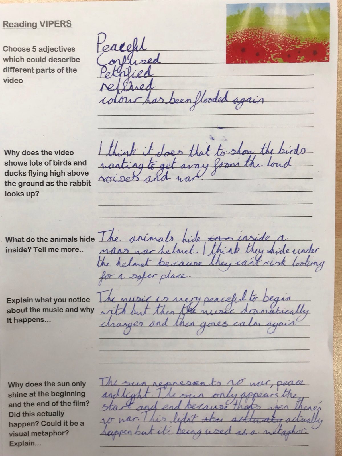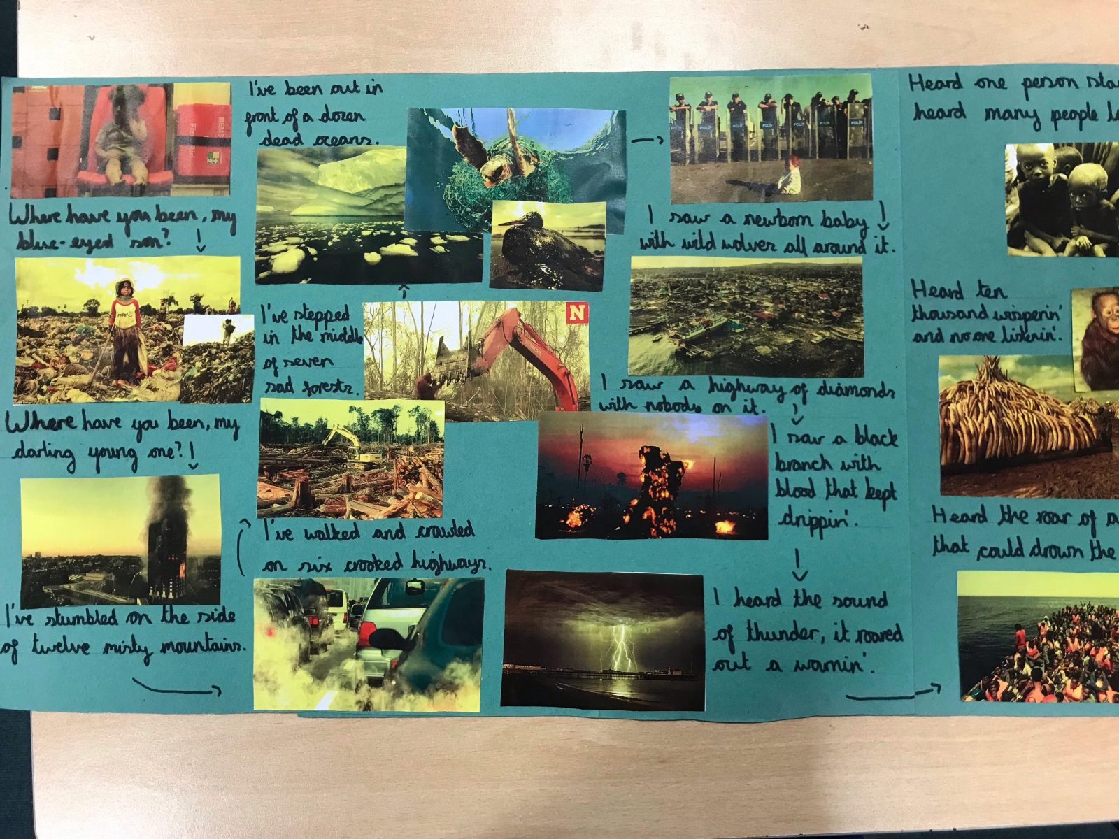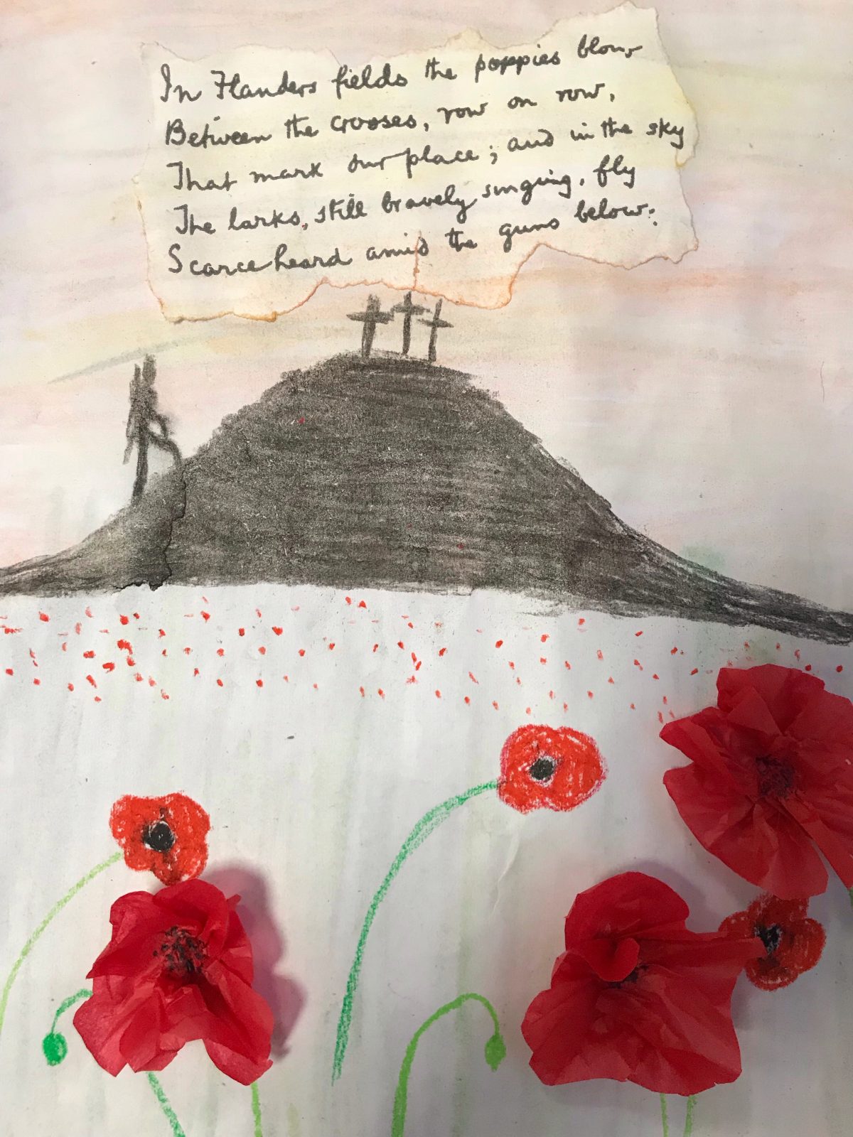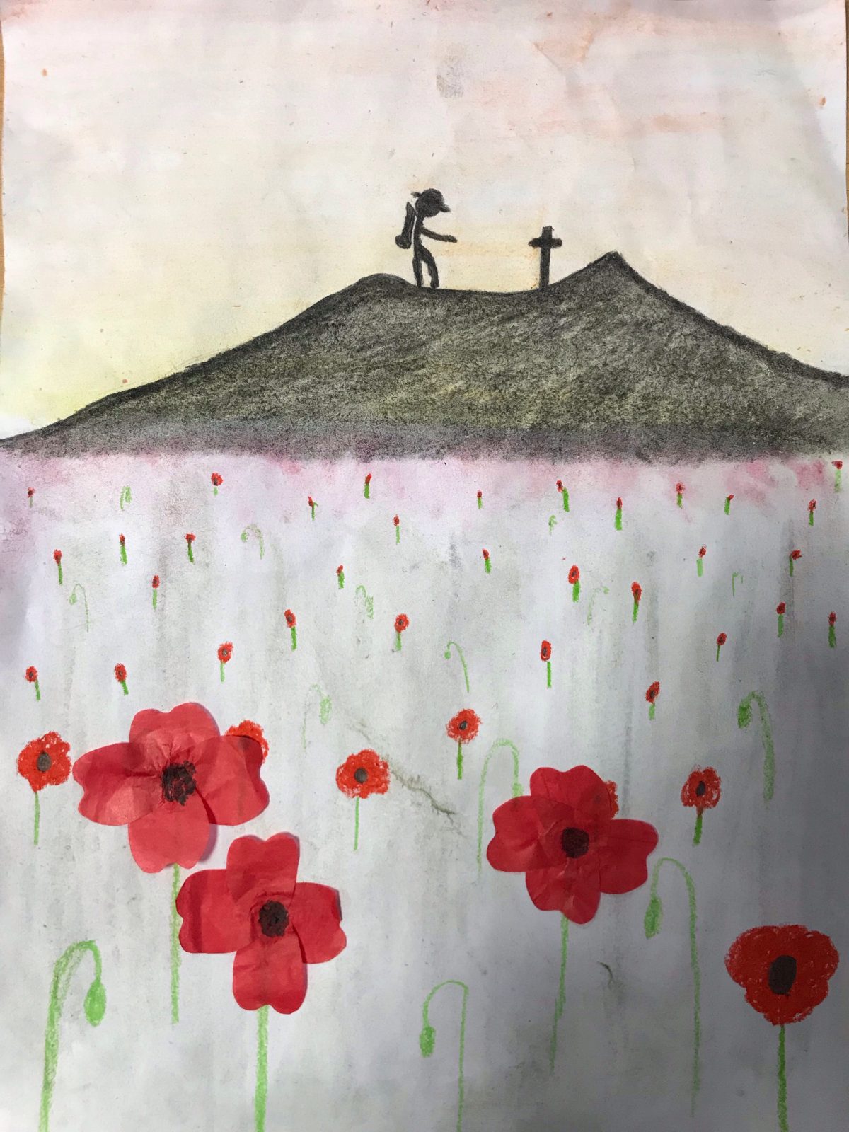 Having completed our work reflecting on some current world issues using the Bob Dylan song ‘a hard rain’s a-gonna fall…’ we moved on to thinking about the centenary of the end of World War One…