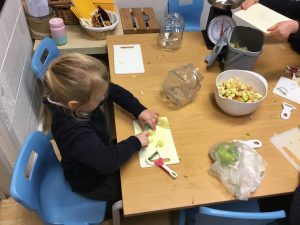 Hazel class have been using their peeling and cutting skills to prepare apples for an apple crumble recipe that we are working on this term. We also started to use the weighing scales to weigh the apples in grams.